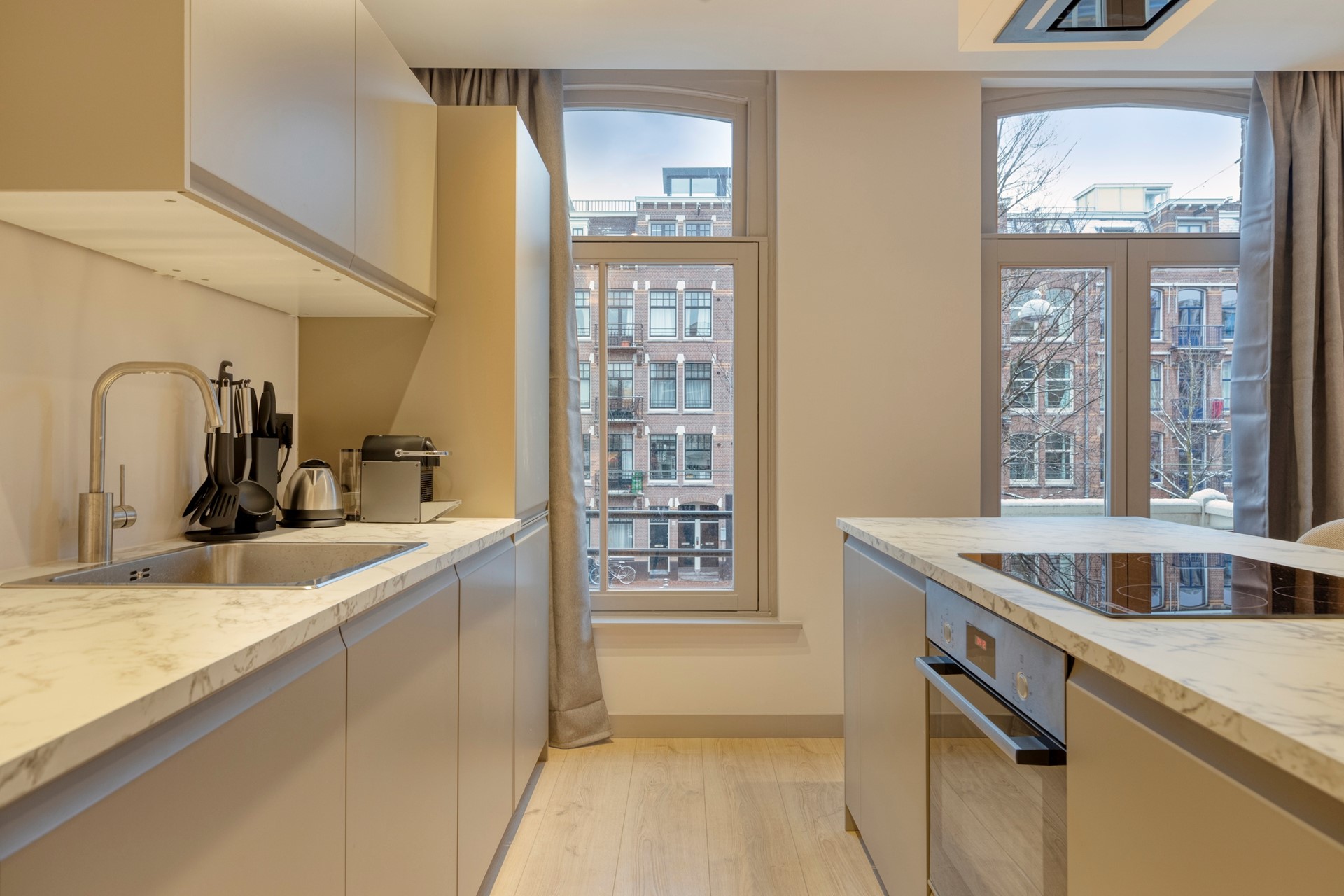 Het appartement is hoogwaardig afgewerkt en volledig gemeubileerd met nieuw meubilair. Grote ramen met dubbel glas zorgen voor veel natuurlijk licht en een rustige, comfortabele leefomgeving. Het privébalkon biedt vrij uitzicht over de stad en is een fijne plek om te ontspannen en van de buitenlucht te genieten.